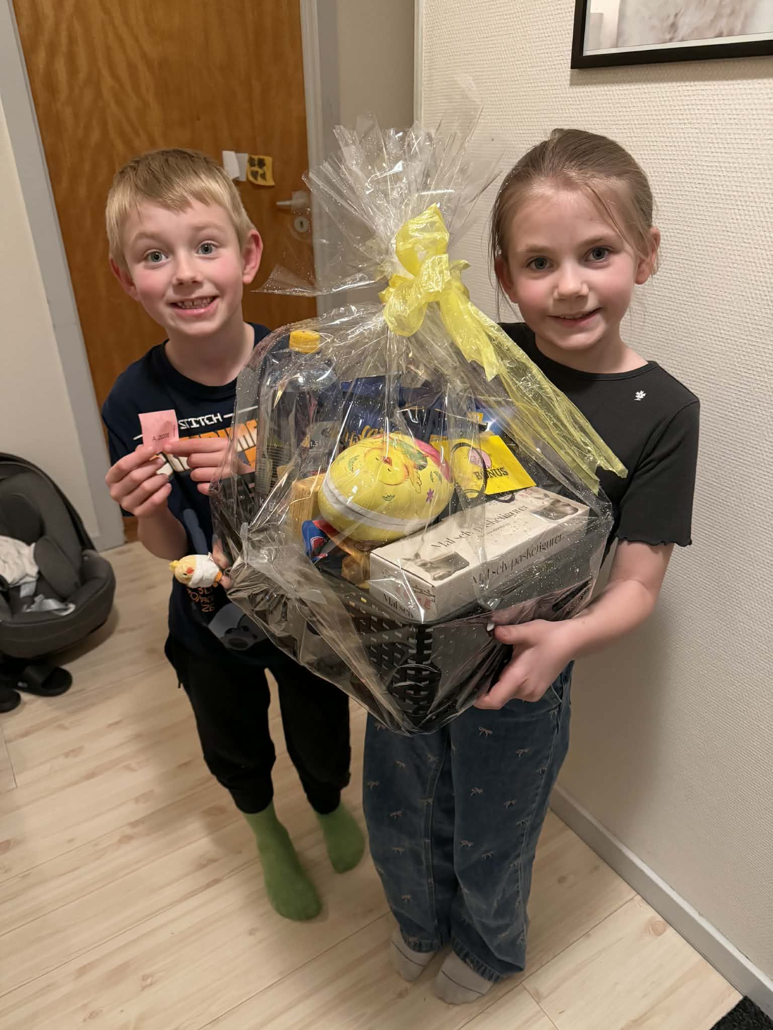 Anton Højgaard vann kurv nr.2 og her síggja vit abbabørnini taka ímóti kurvini.